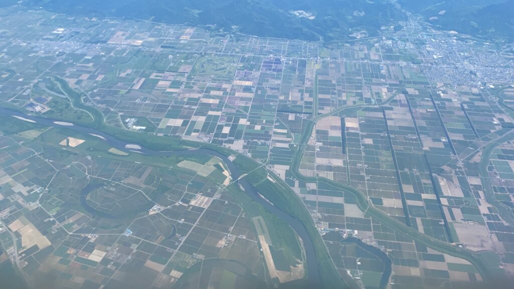 低空で飛ぶから、地図を見ているみたいに感じる。