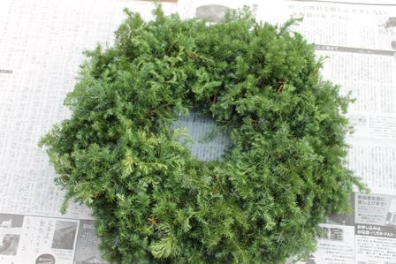 これは市販のリース台ですが、これに束にしたヒムロスギやヒバをつけます。