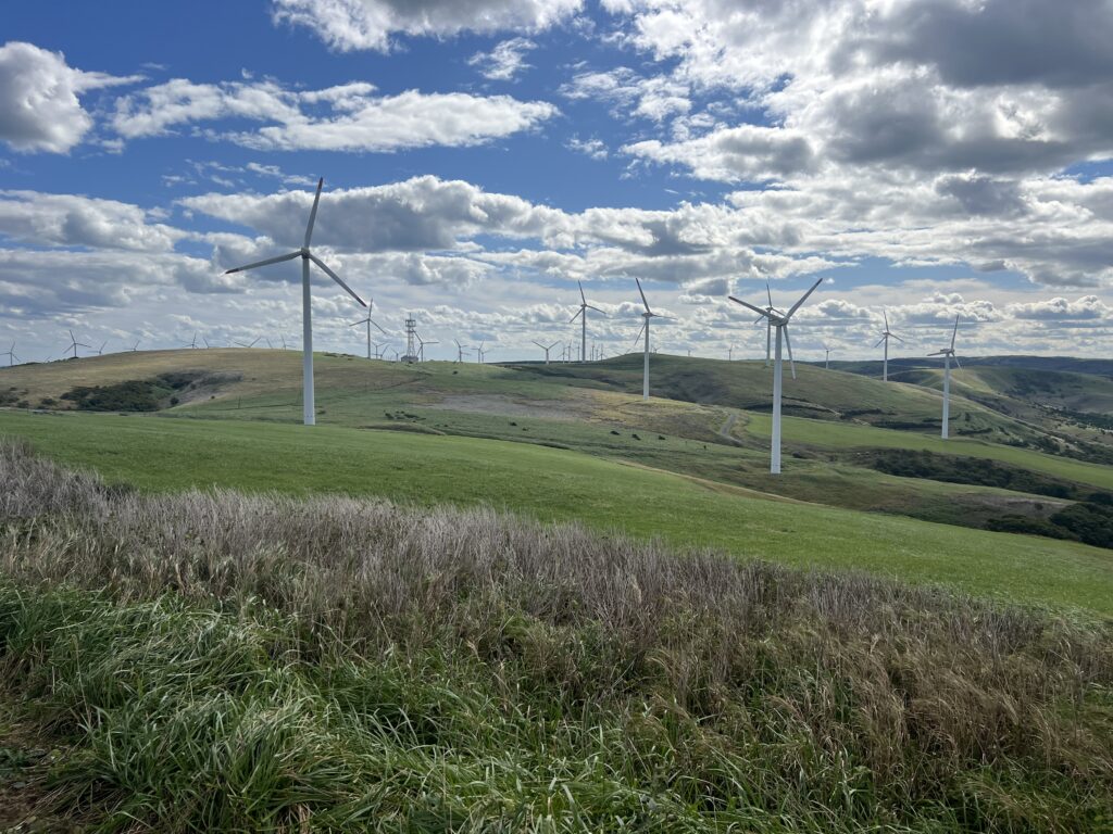 そこに見た目100本以上の風力発電の風車と、パラパラと黒牛、時々鹿の軍団、牛舎。