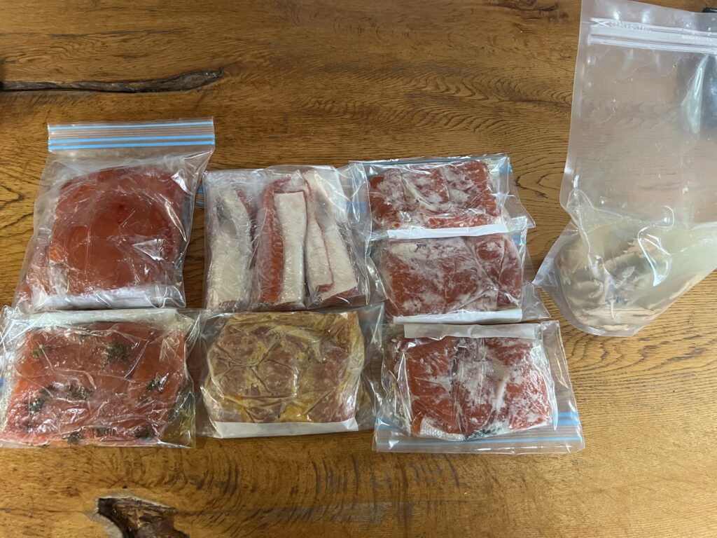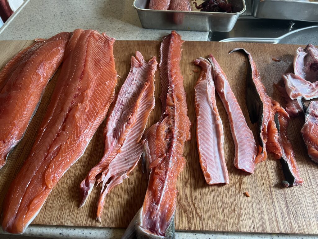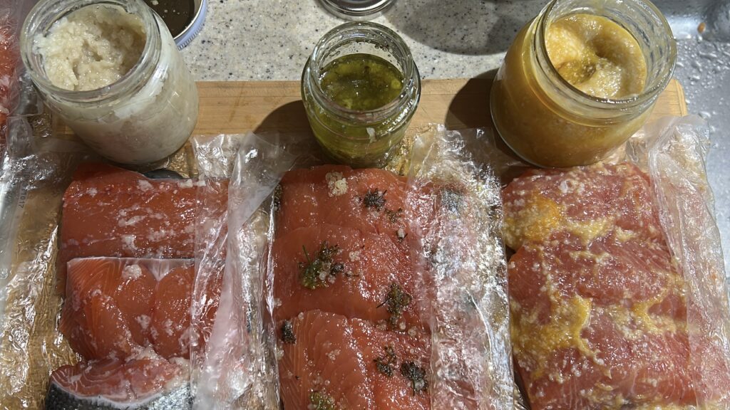 サケは切り身にして、各家族、友達に分配、のあと薄塩、寒糀漬け、フェンネルオイル漬け、梅寒糀漬けに。