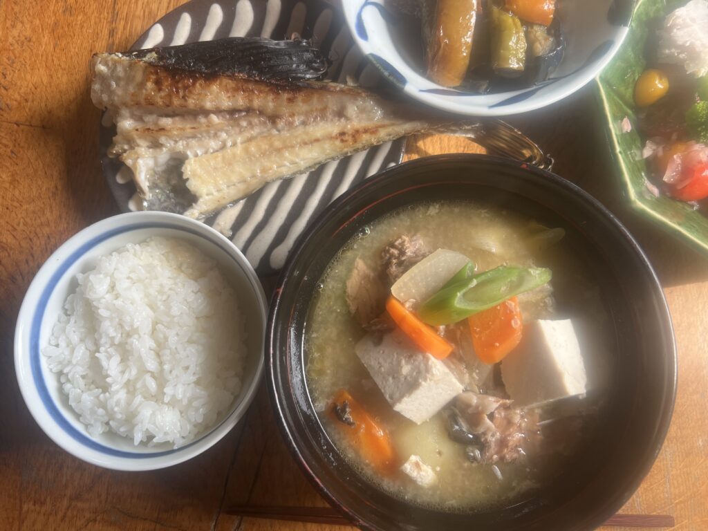 昼ごはんに鮭の味噌汁(石狩鍋風)を作り3家族に配る(笑、忙しい)