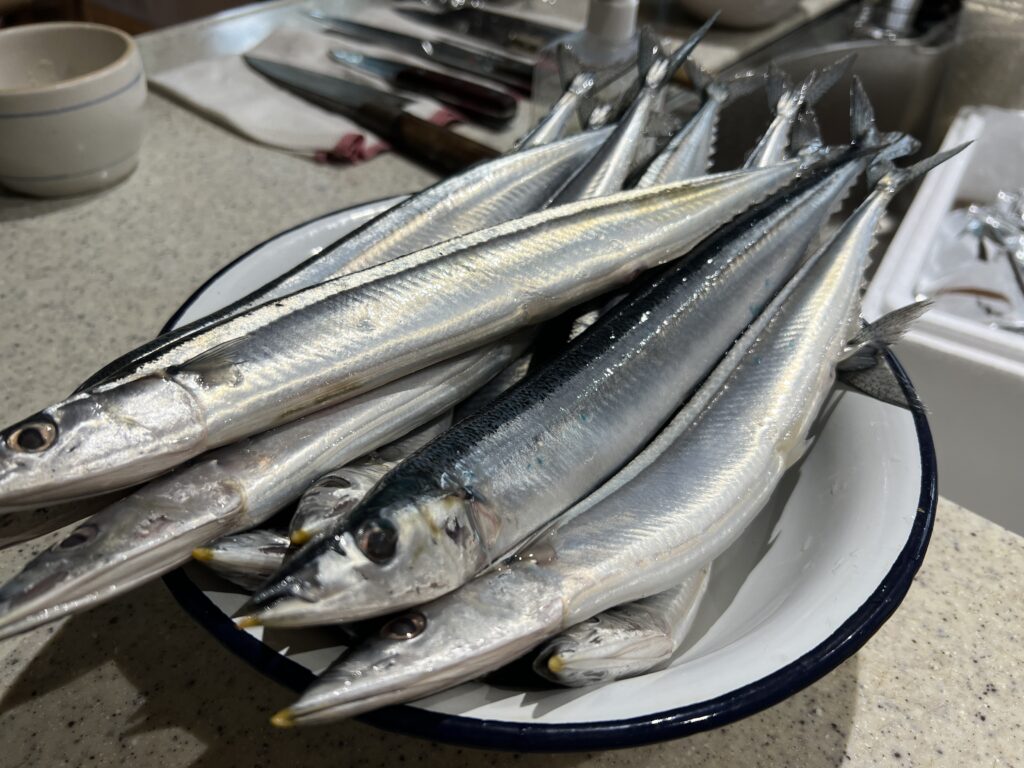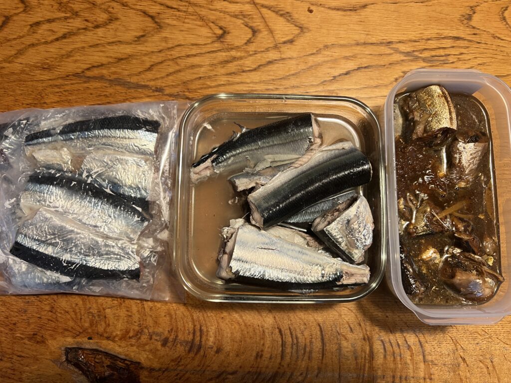 右から骨ごと梅煮、茹でサンマ、背開きにして寒糀漬け。