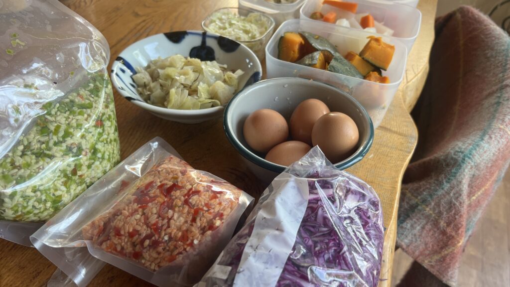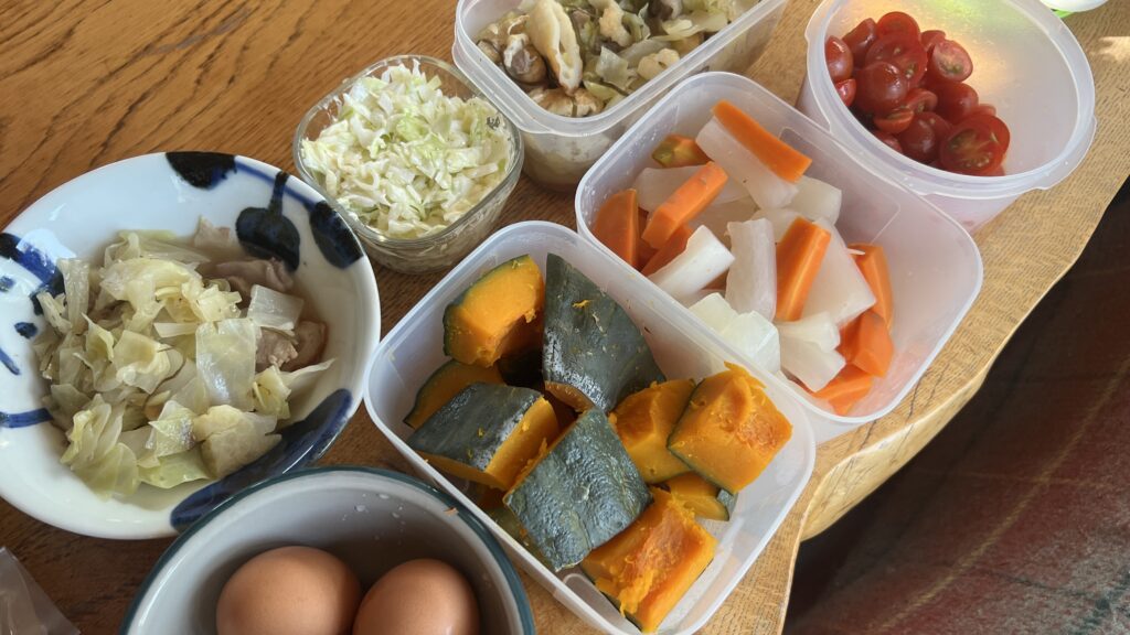 茹でカボチャ、茹でニンジン大根、ミニトマト少し味付け、キャベツの煮物、コールスロー、茹で卵。