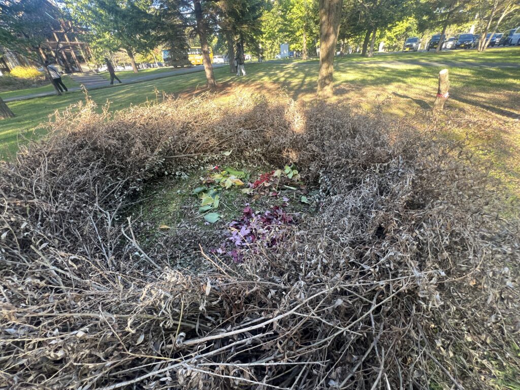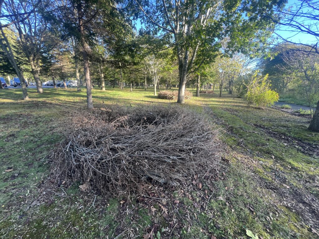 バイオネストとは剪定した時に出た枝で鳥の巣のように編み込み、その中にガーデンや菜園から出た残渣を入れます。