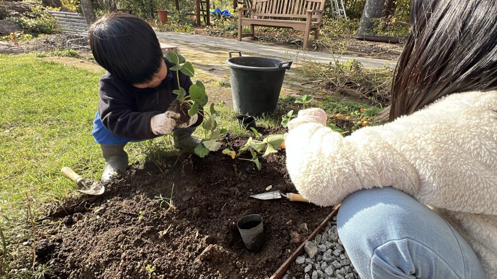 もちろん冬囲い中断して、孫と一緒に植えましたよ。