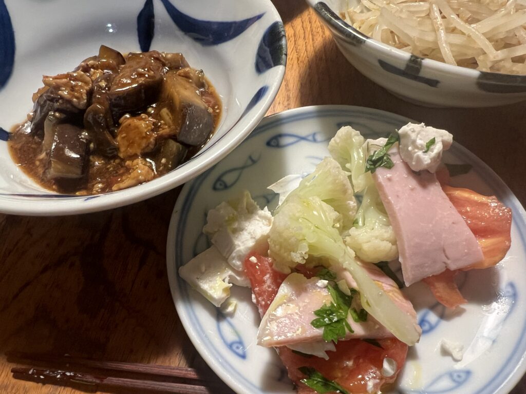 麻婆茄子だけのつもりが、もやしのナムルと、サラダ的なもの。