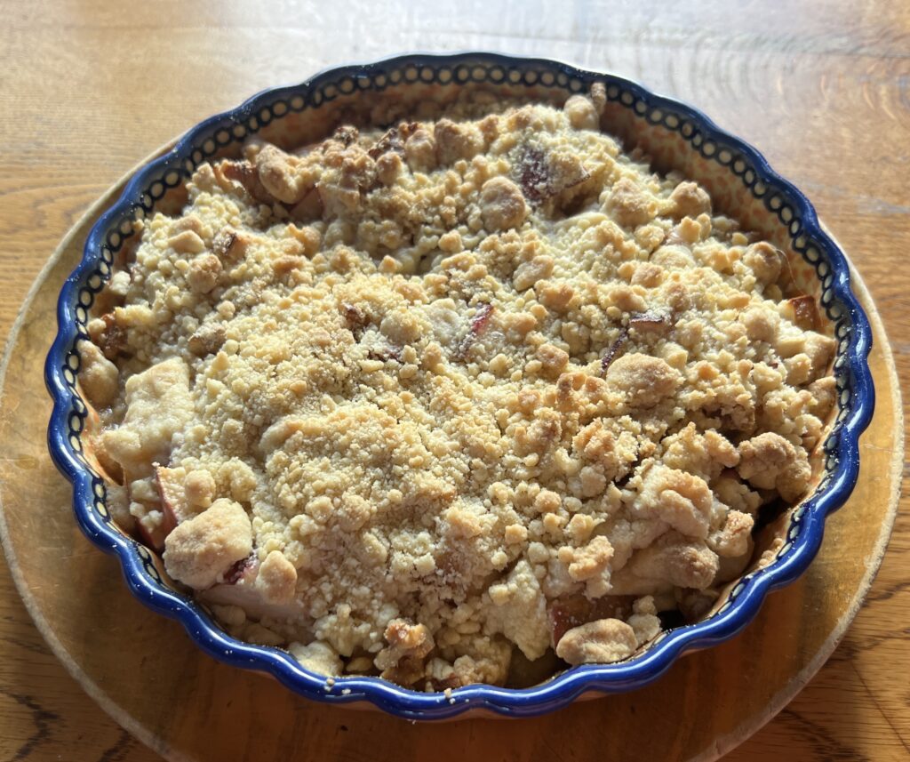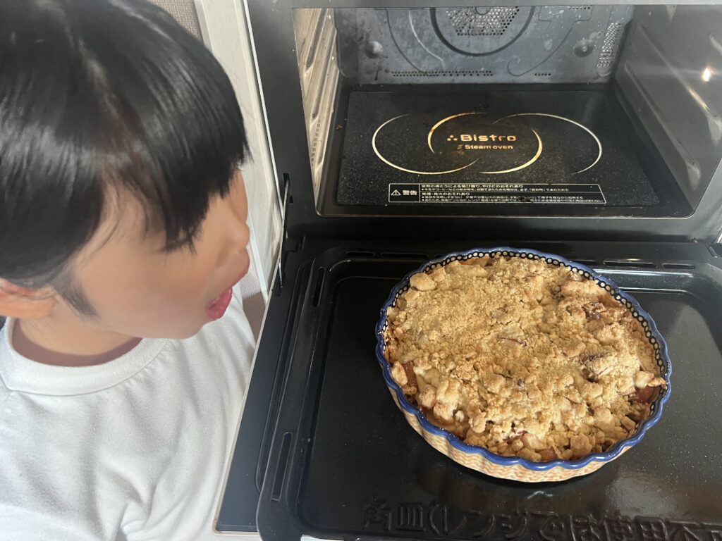 リンゴを切って砂糖、メープルシロップを混ぜ混ぜし、くるみを加えて水分出るまで暫し置き耐熱容器に入れ、冷えたクランブル生地を上からばら撒き、オーブンで焼く、というものです。