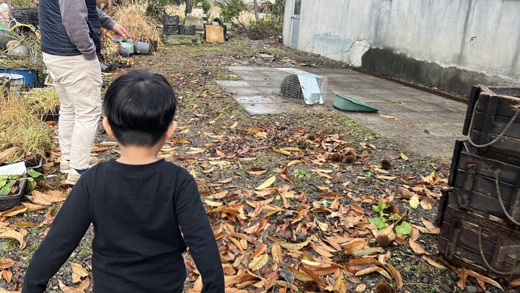 もしかしてラスカルだったら、、、と、箱罠の中には最後のキャラメルコーン(いつも食べ逃げされていた)、近くに食べ散らかした銀杏を集めて置いておいたら,、、、