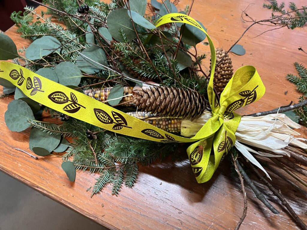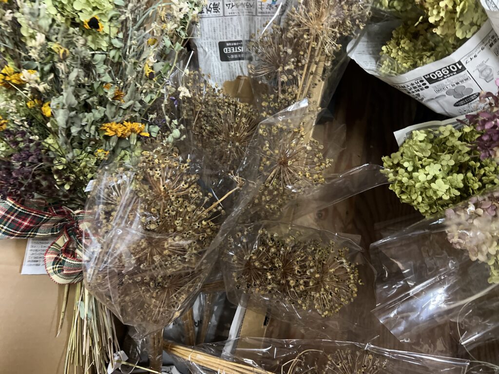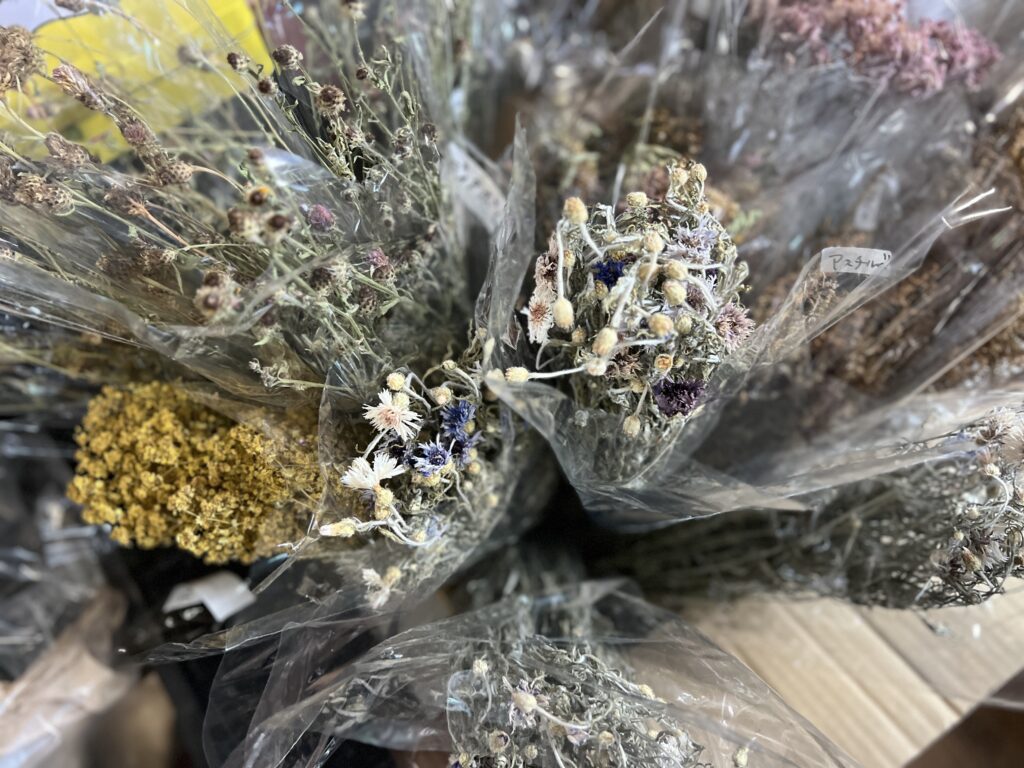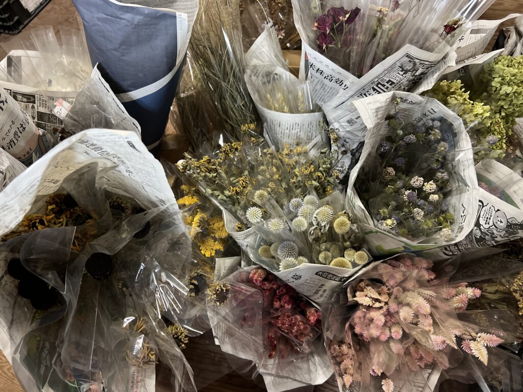 スワッグはドライフラワーとフレッシュ材料からお選びいただきますが、ガーデナーたちが採取して作った多くのドライフラワーができていました。
