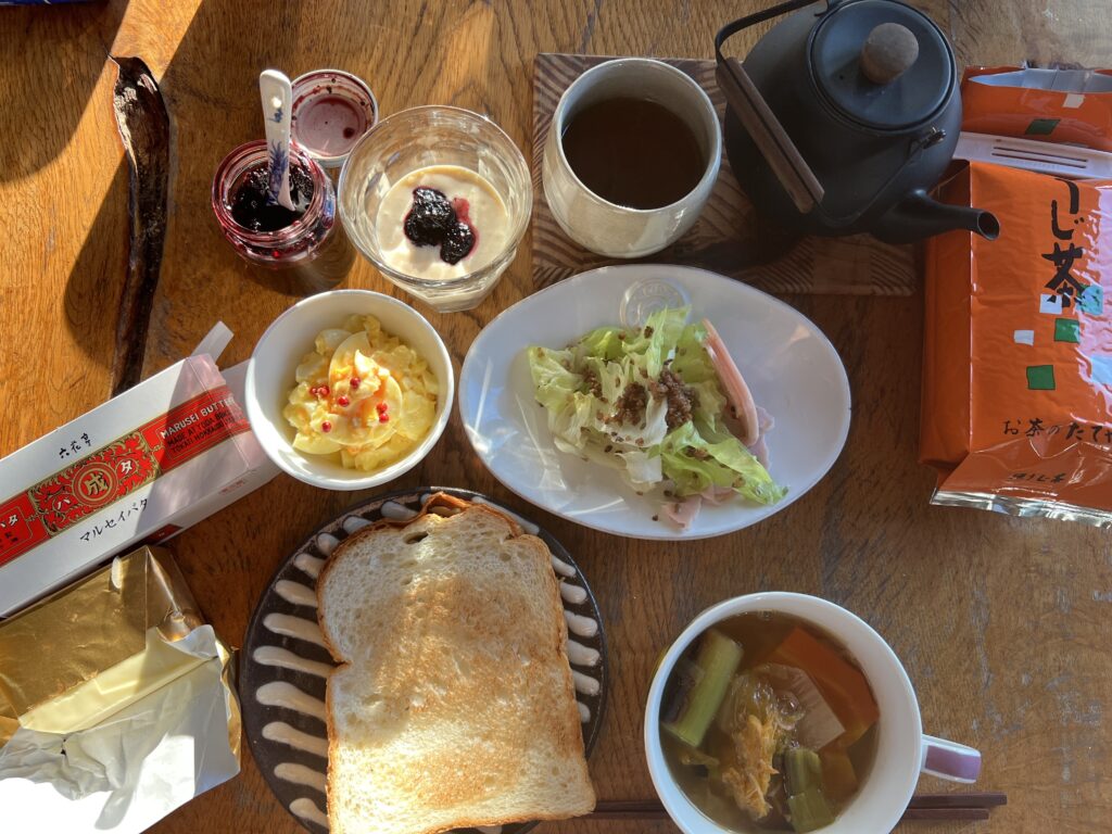 ノーザンホースパークの食パン、押谷ちゃんお土産の六花亭のマルセイバタ、押谷ちゃんの黄色い白菜と月形の友達ドラちゃんからもらったリーキのスープ、山本先生手作り桑の実ジャムのスムージー、人吉のお茶屋さんのほうじ茶。レタスのトッピングは蕎麦茶の出し殻のオリーブオイルと塩とバルサミコで味つけたもの。