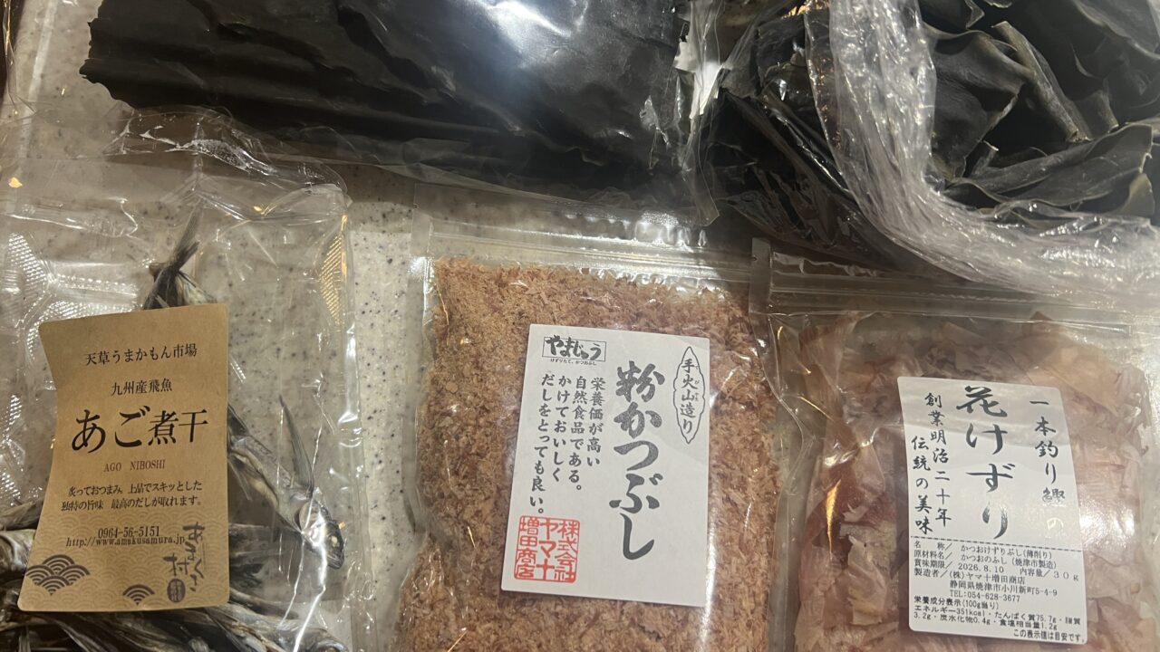 熊本で買ってきたあご煮干し(はじめて使う)、静岡土産のかつぶし、真昆布と襟裳漁師さんからもらった根昆布。