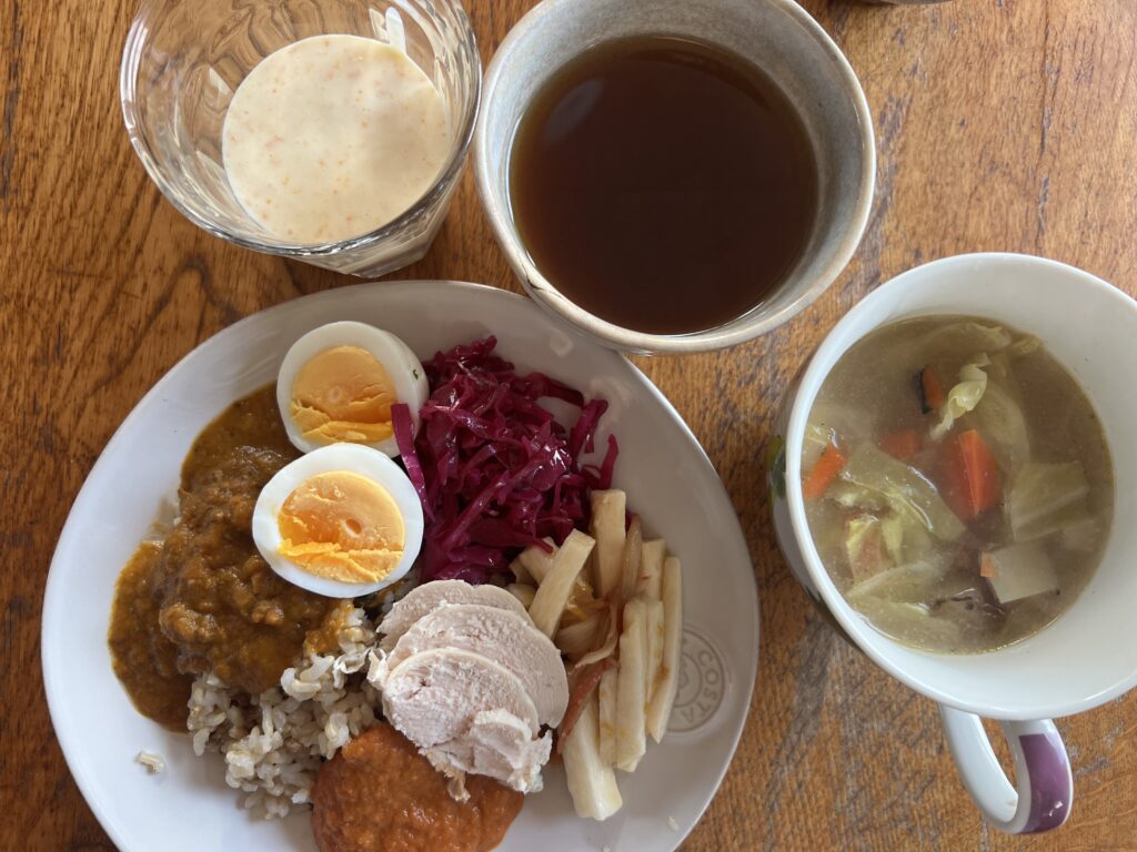 で、朝ごはんは玄米に牛カレーとトマトカレーの相がけ。スープは塩なし昆布だし。