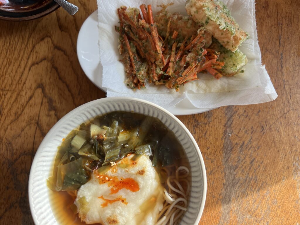 お昼は1人前のそばを半分ずつに餅。