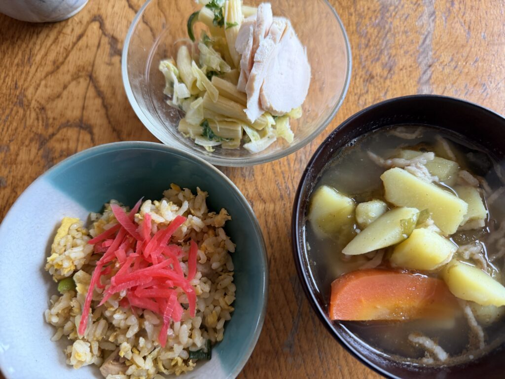 朝ごはんは昨日夫さんが飲み会からのお土産のチャーハンとスープとマカロニサラダ。