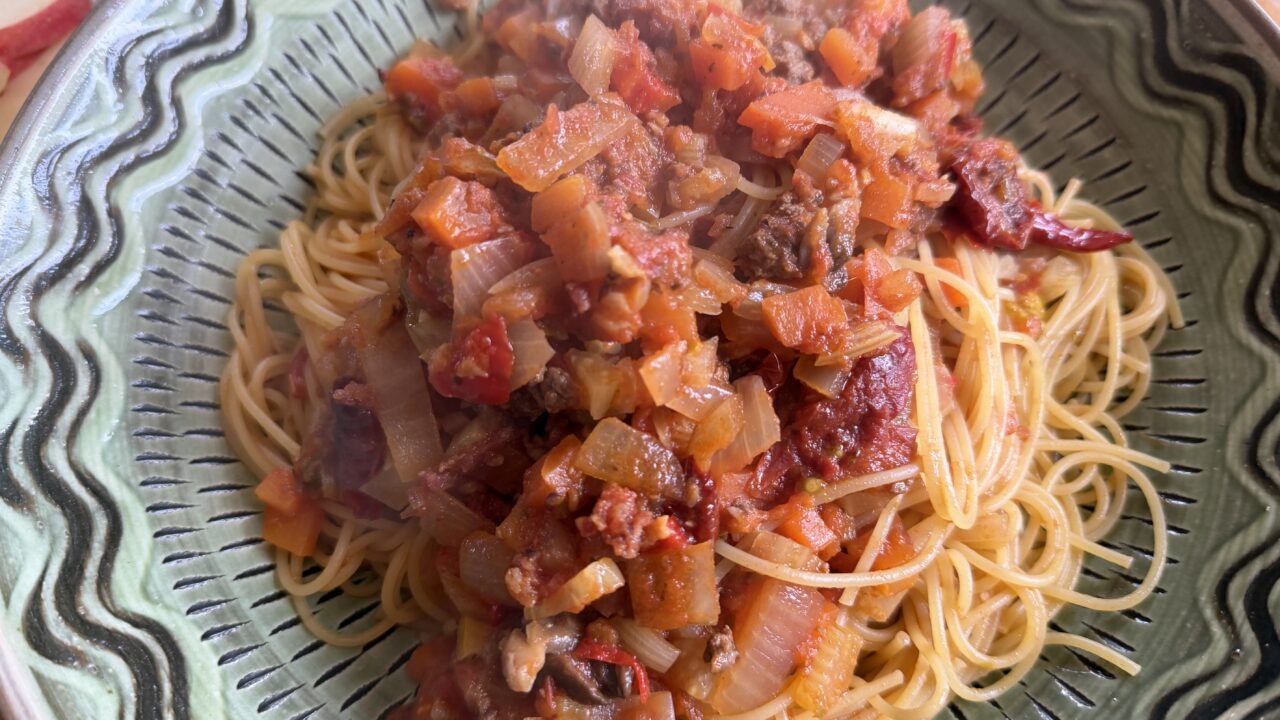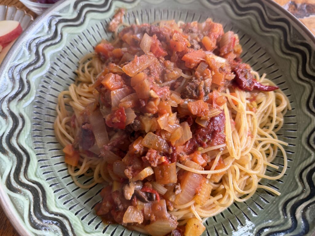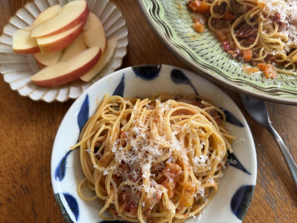 お昼は夫さんが大喜びだった先日の野菜たっぷりミート少しのパスタ。