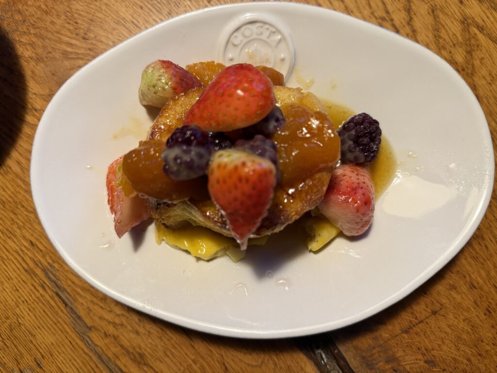 夫さんがたまたまイチゴを買ってきてくれたので、冷凍庫ブラックベリー、自家製杏コンポートも使って。