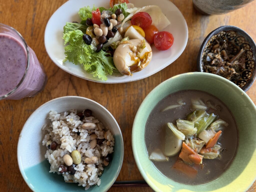 豆ご飯、豆の湯で汁スープ、豆のサラダ、スムージーの豆乳も今日は茹で汁で。