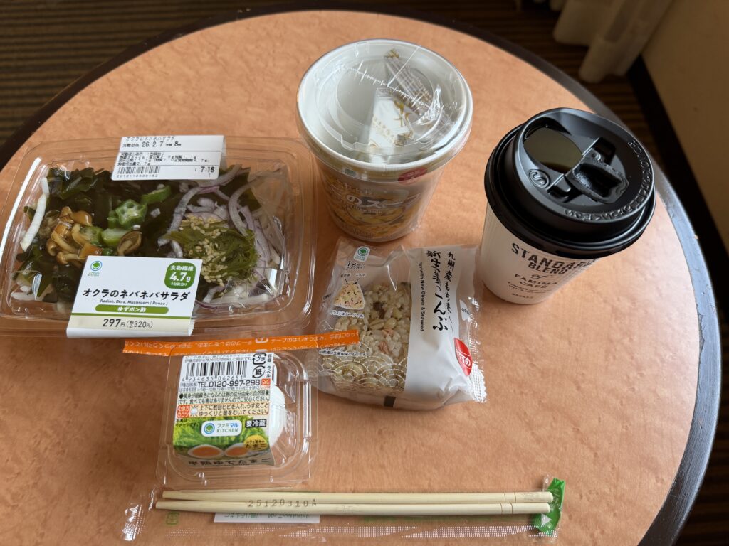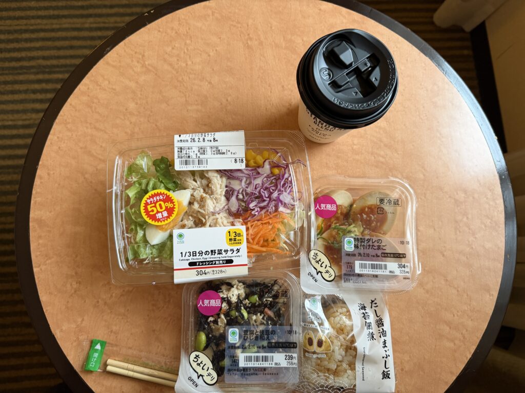 朝食付きだと食べ過ぎちゃうので、今回コンビニ食にしてみました。