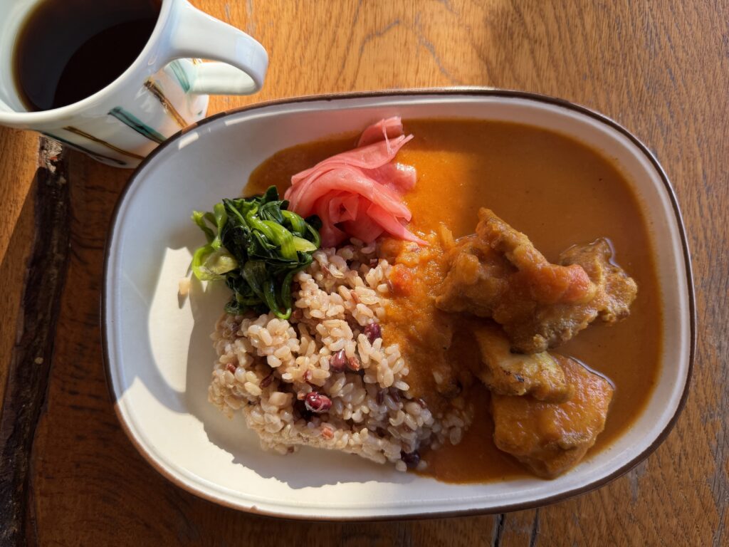 麦と小豆入り玄米ご飯100グラムにトマトカレー200cc、チキンもタップリ。