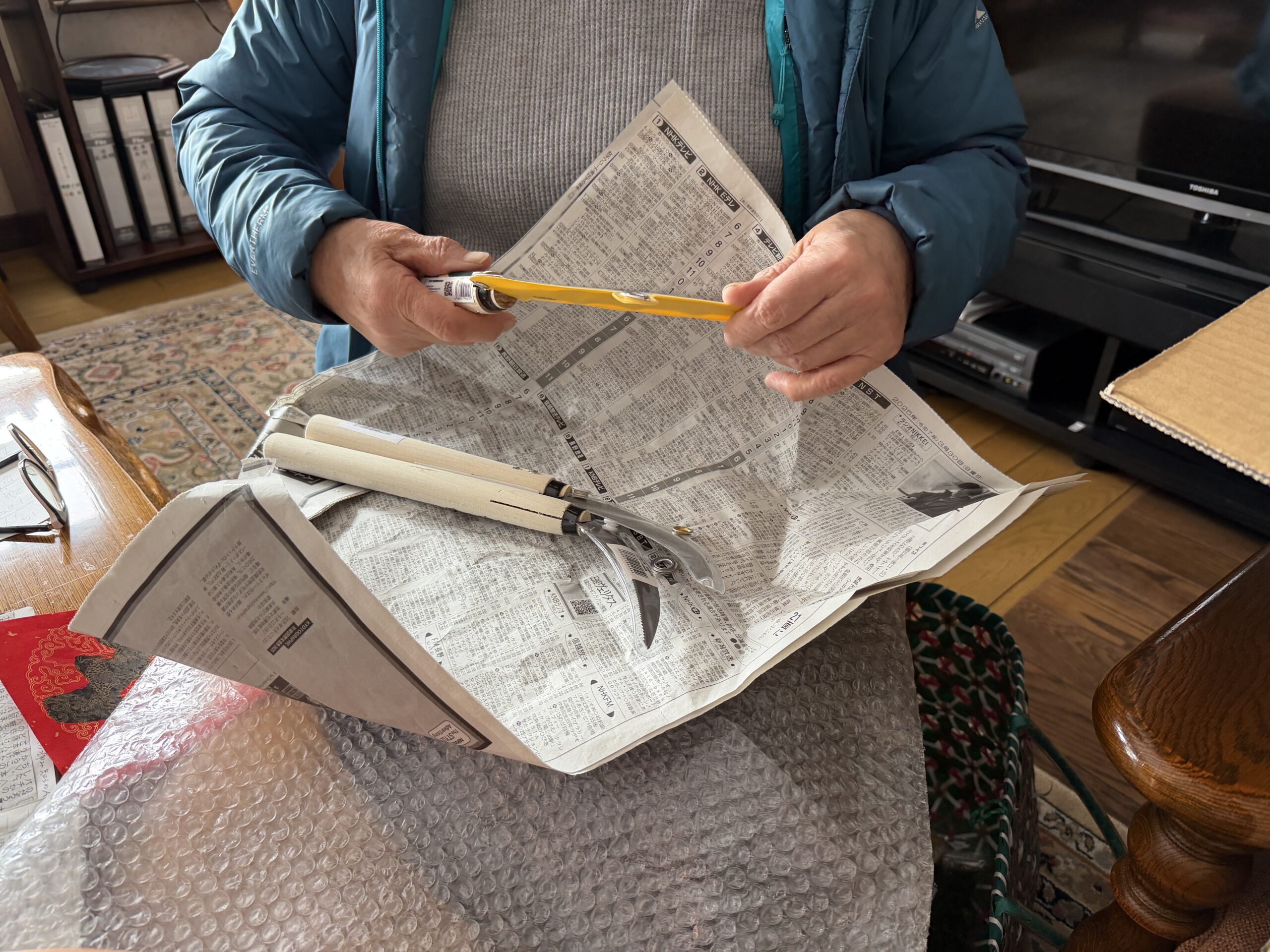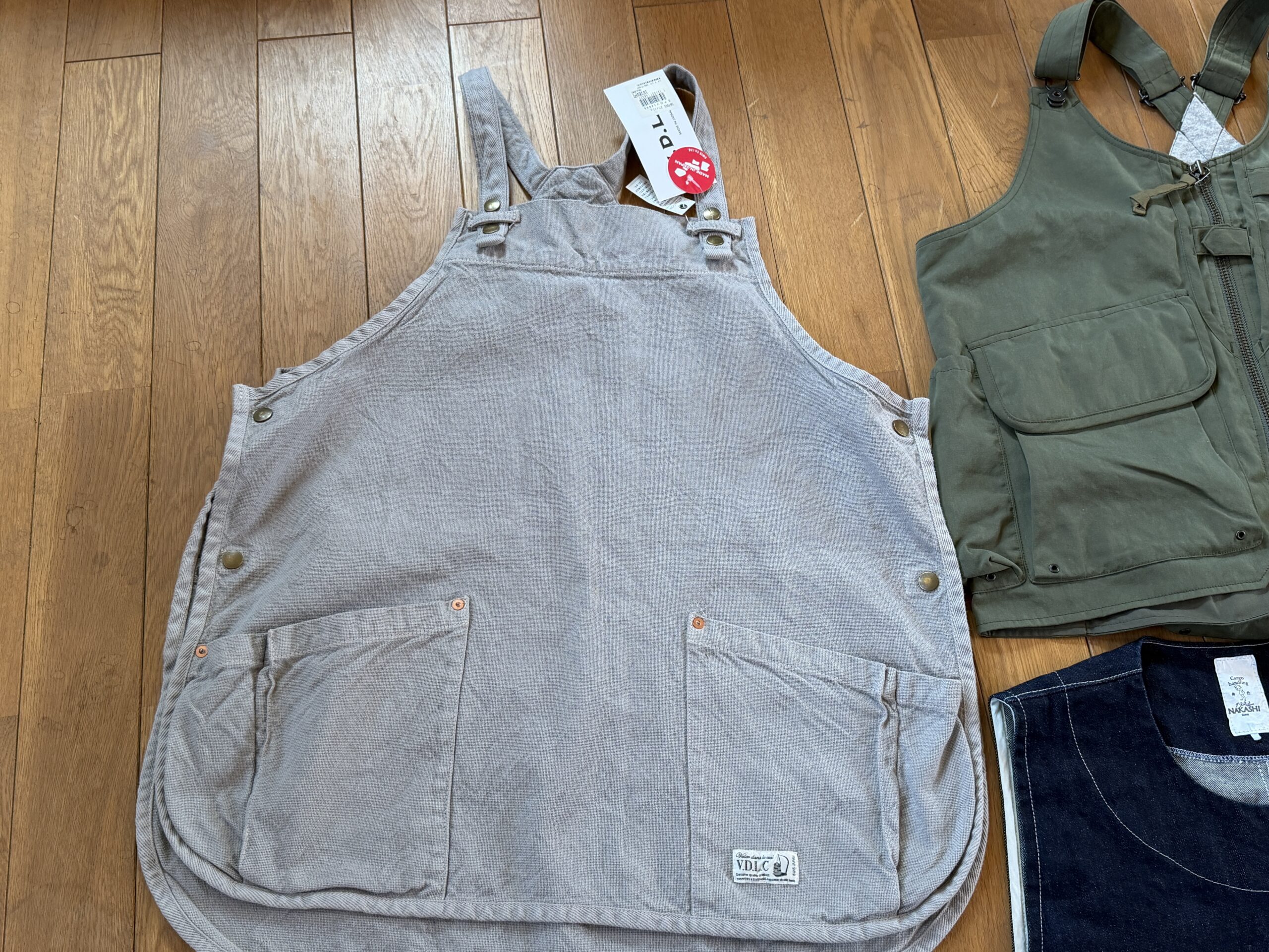 大きめの茹で用銅鍋と草取り鎌3本、ガーデン作業用のエプロン作ろうと思っているので、そのサンプルとして2枚のエプロン。