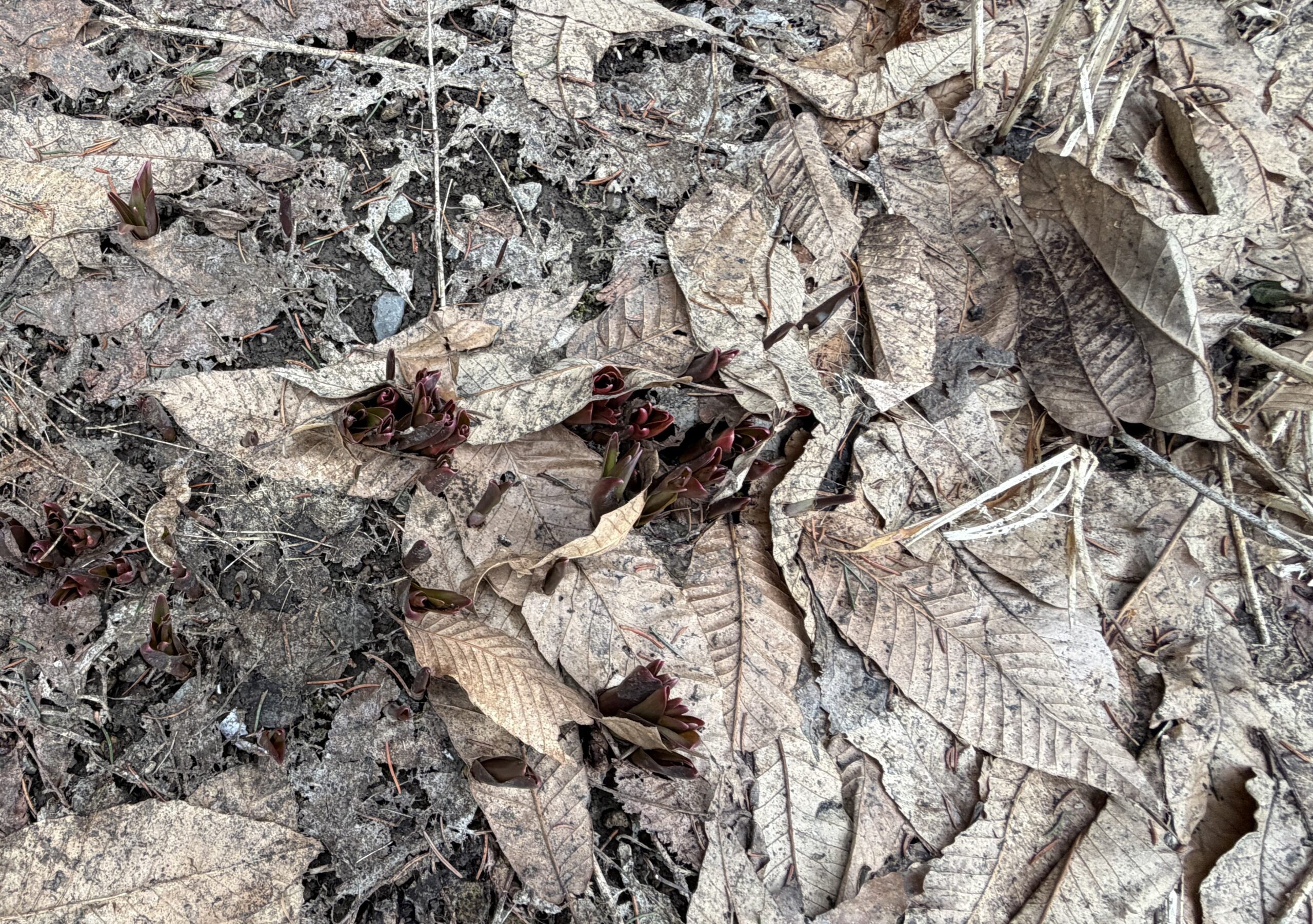 宿根草たちは落ち葉に守られている。