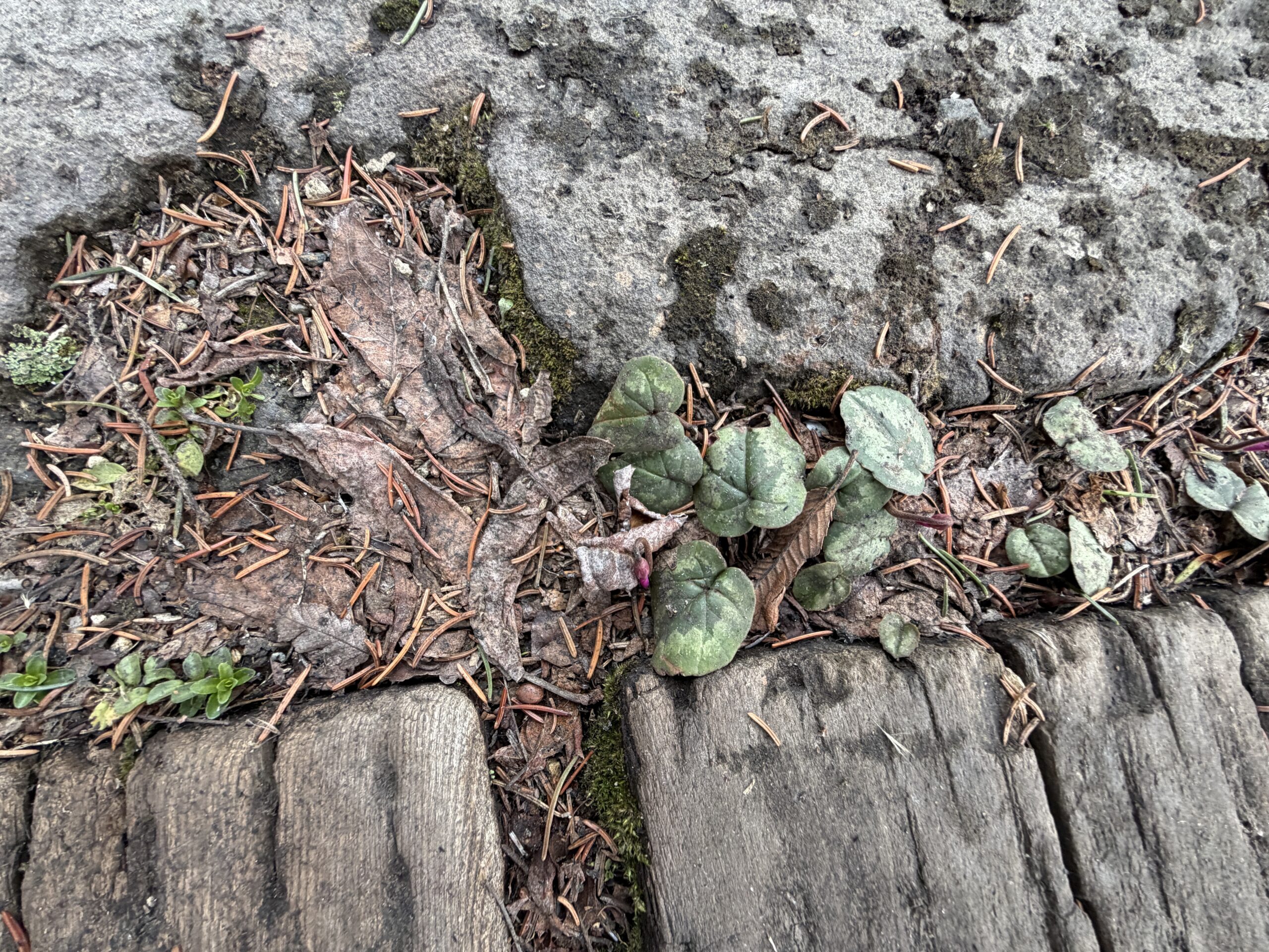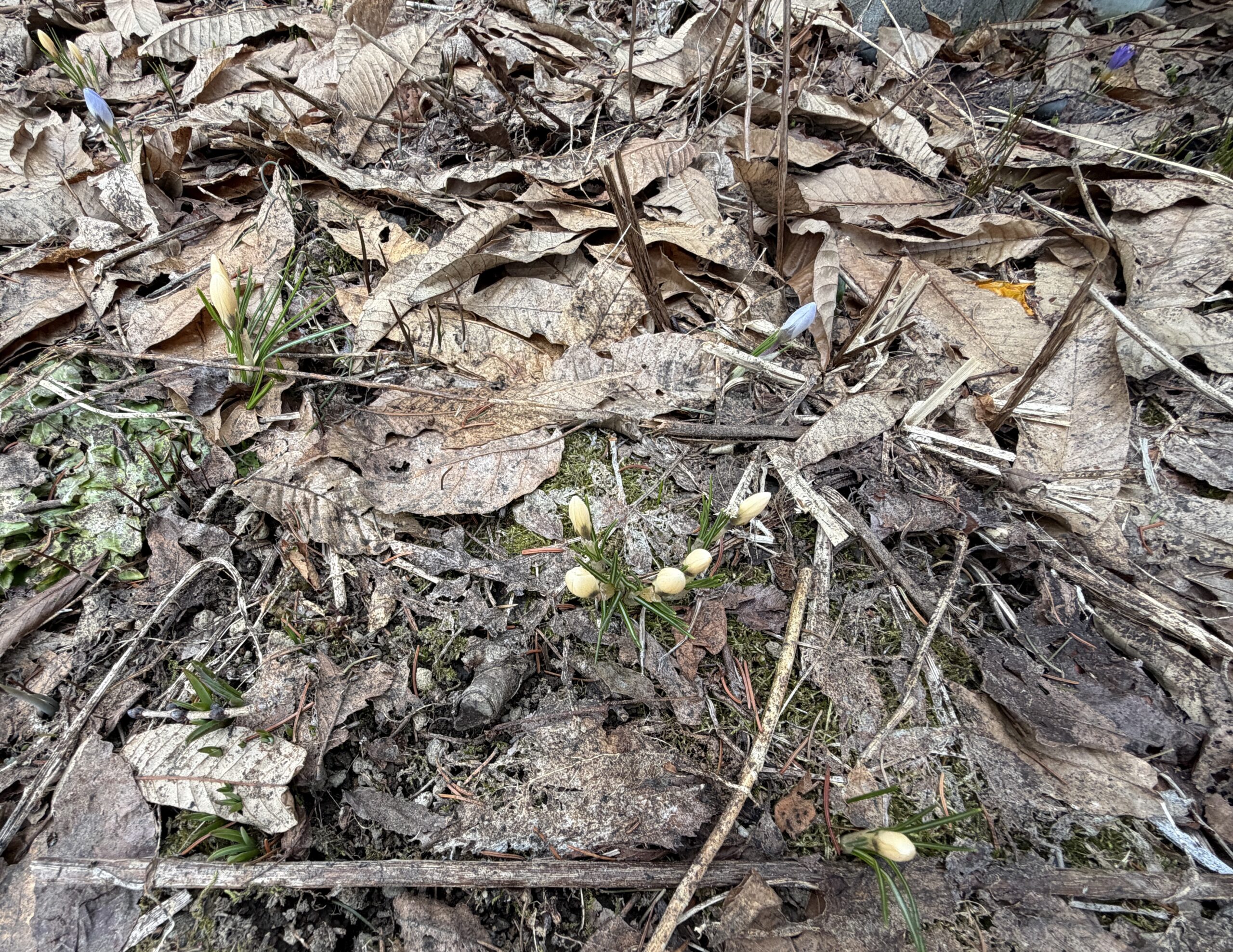 雪が溶けたところから、芽が出始めている。いつも一番乗りはシクラメンとクロッカス。