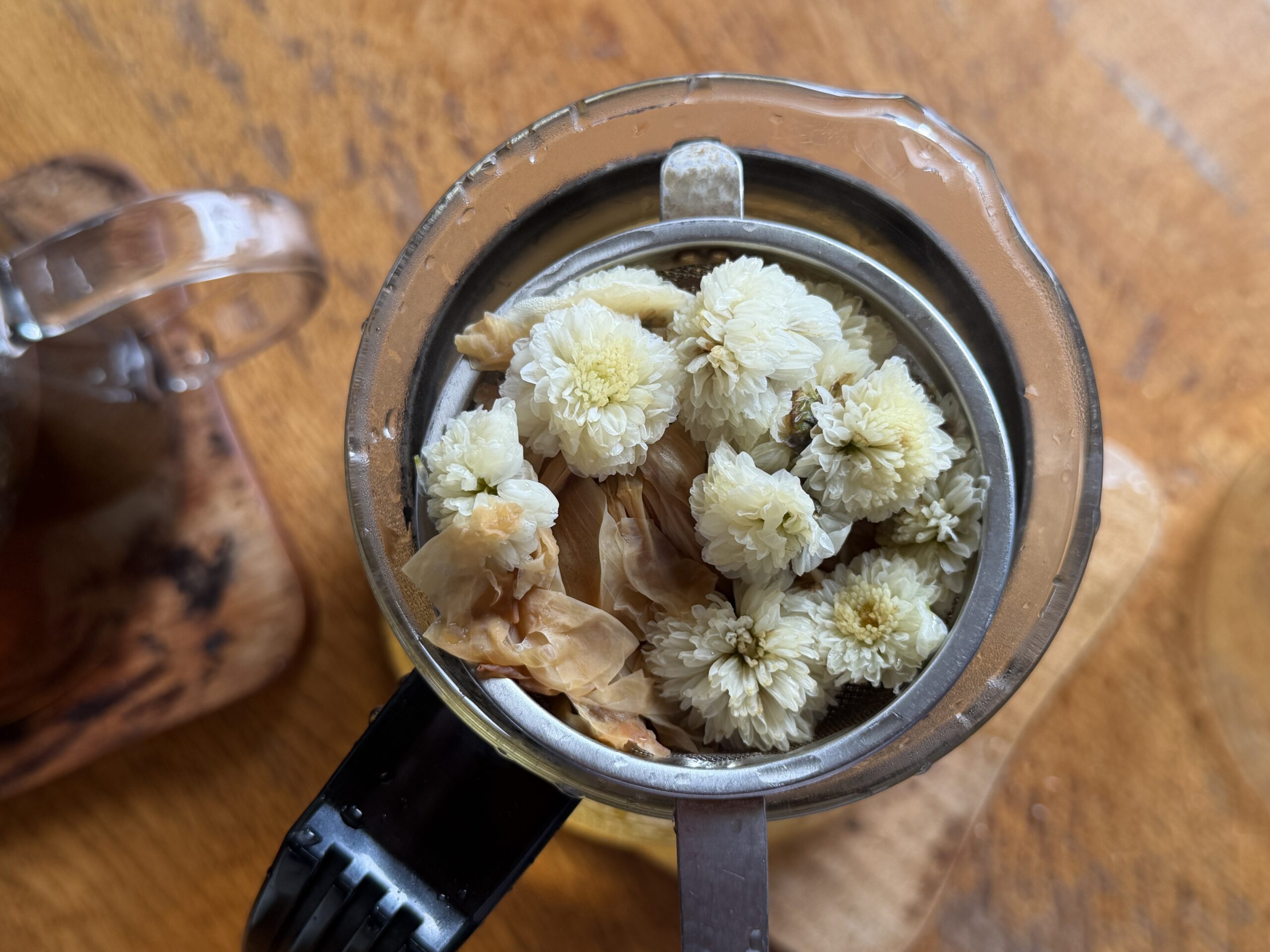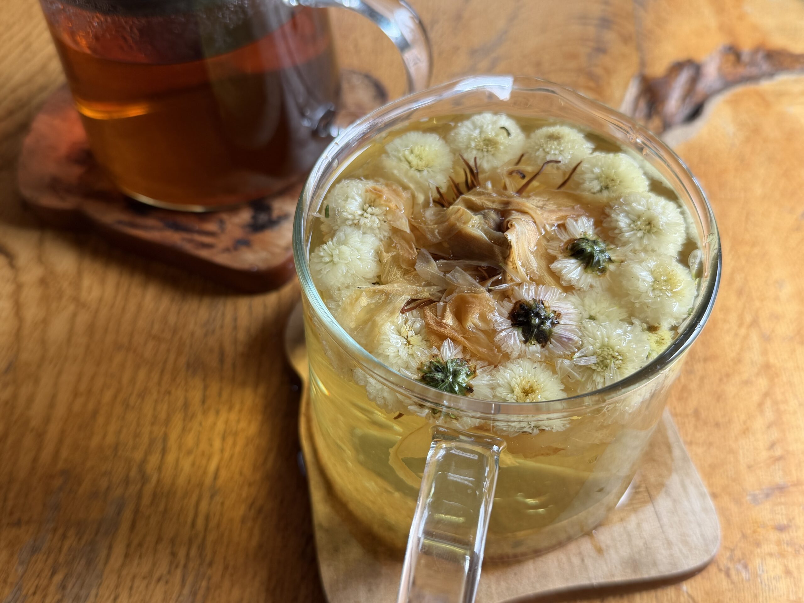 真ん中がハス茶。今日はフュバーフューのお茶を足しました。
