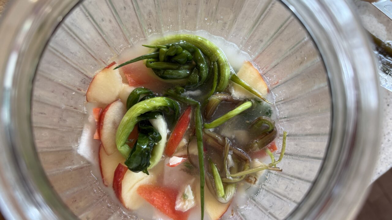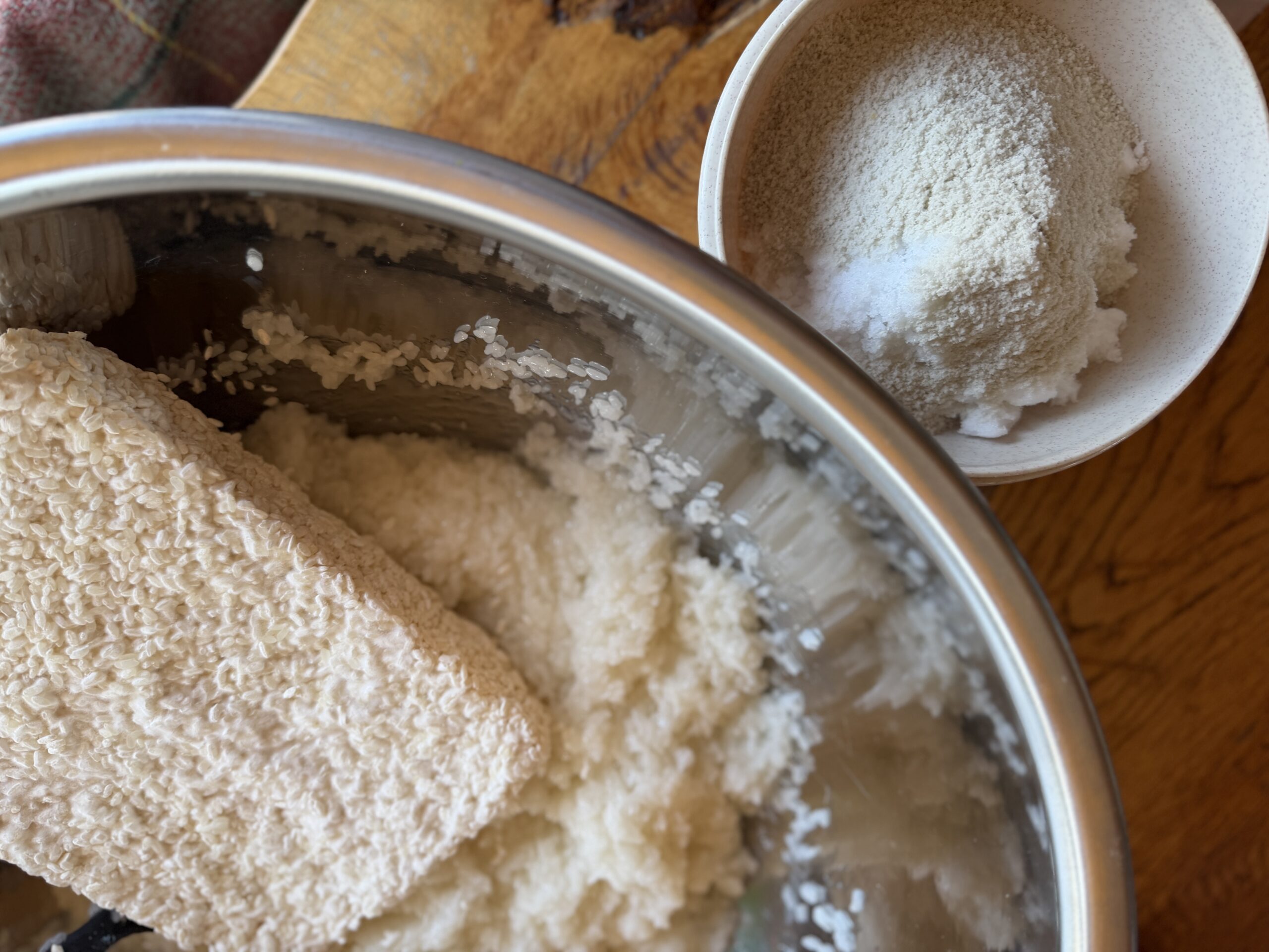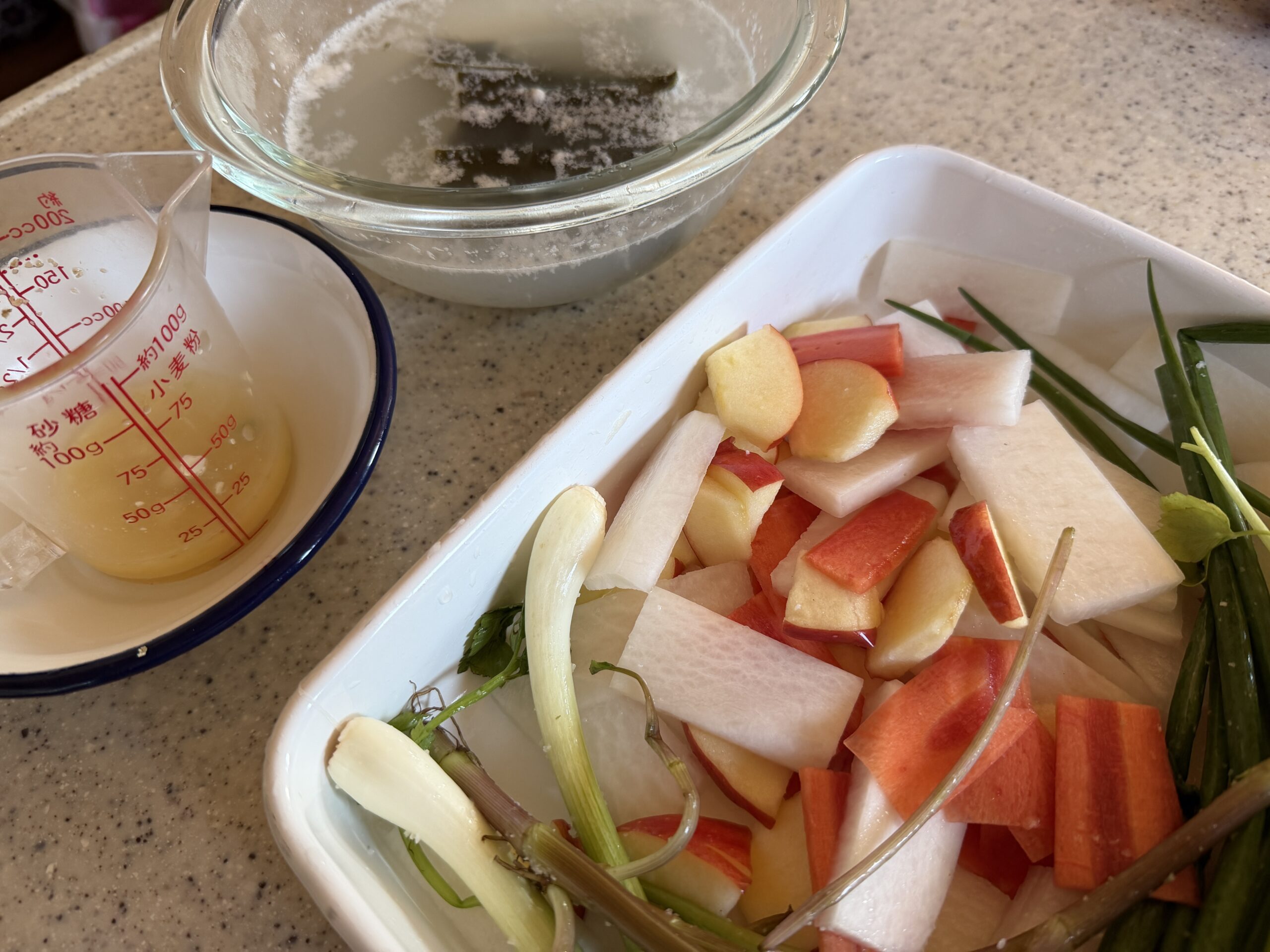 そしてご飯炊き上がりを待ちながら、、、こちら。大量の研ぎ汁が出たので、水キムチ作りました。