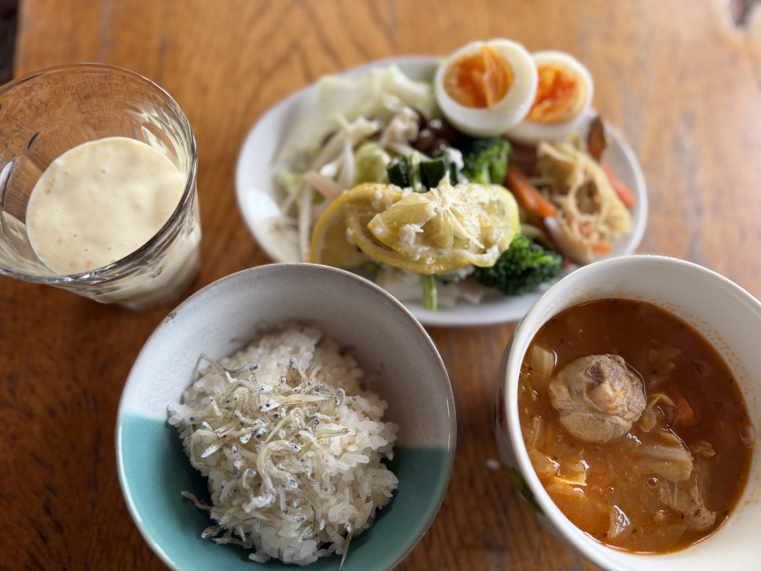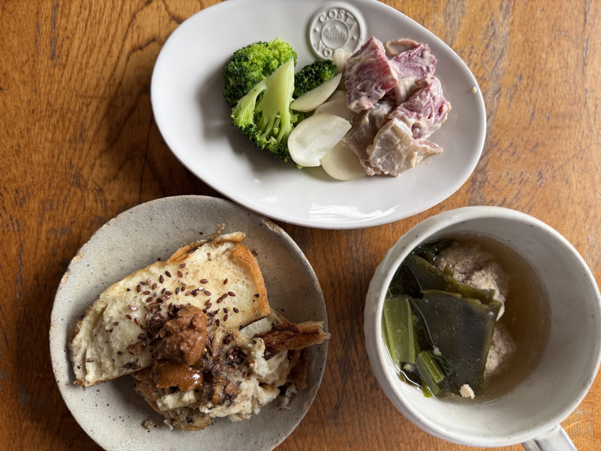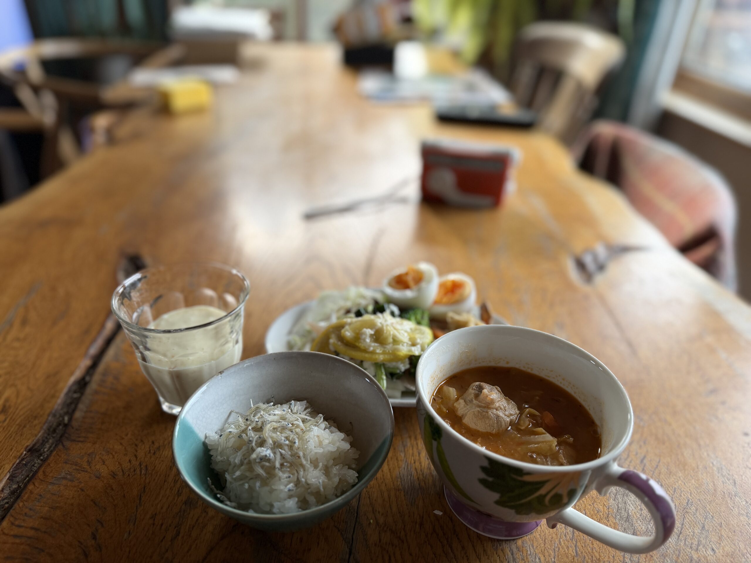 いつもあまりものですが、今朝は夫さん留守だったので、さらにあるもの朝ごはん。