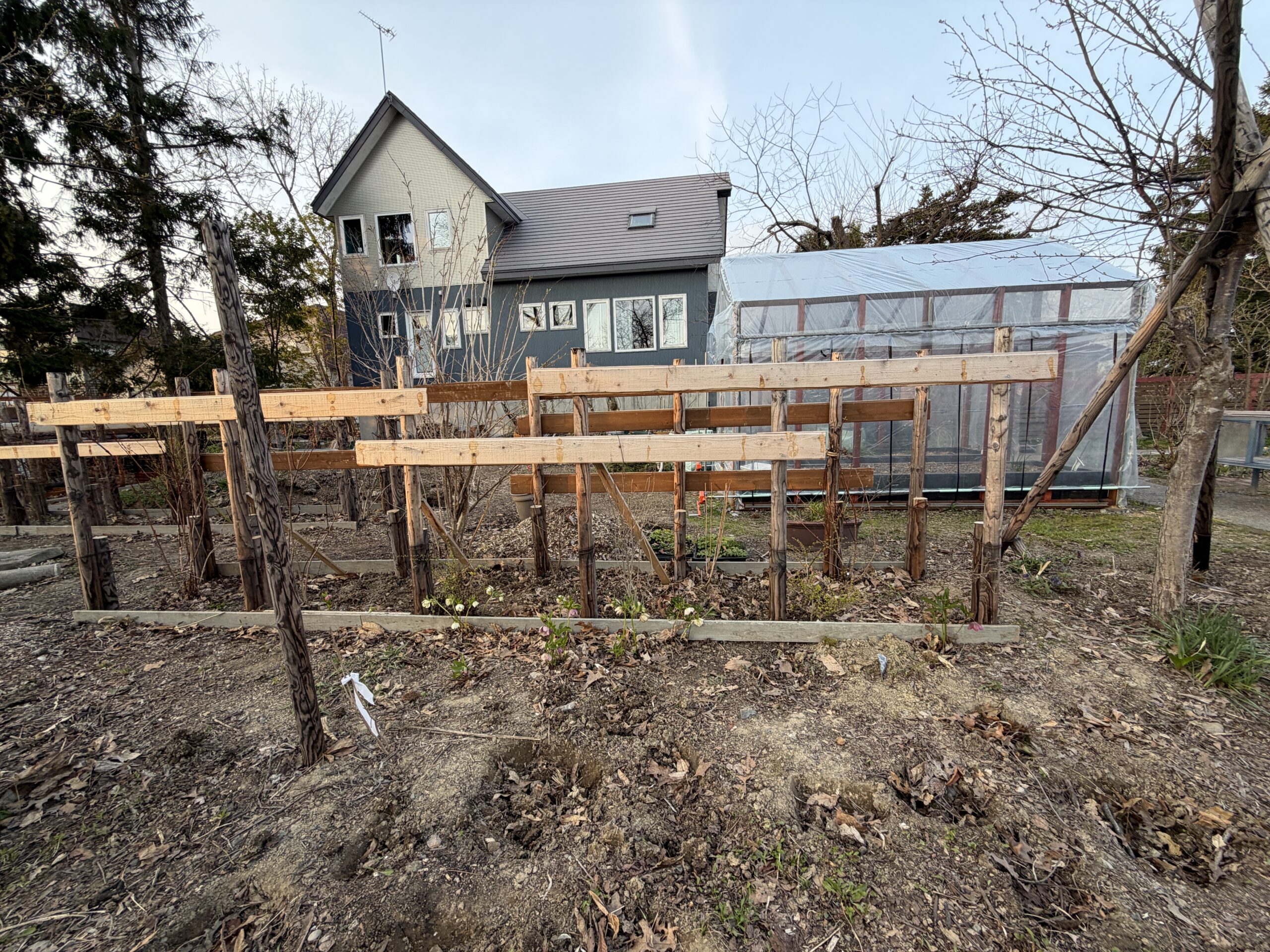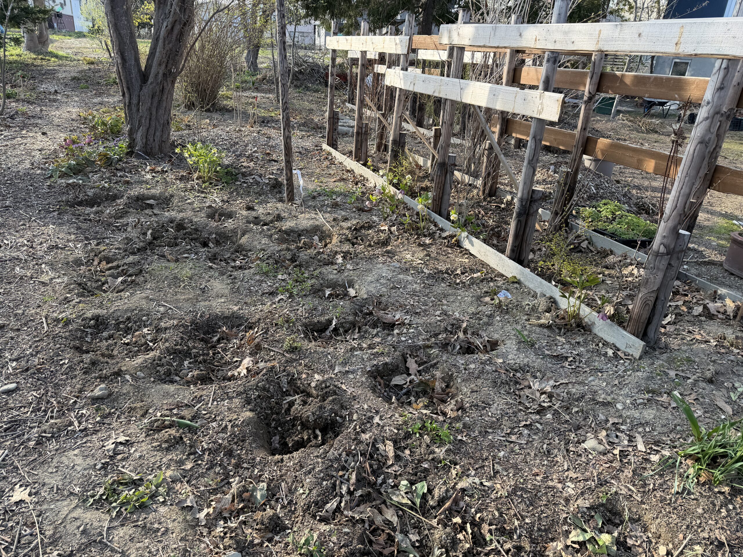 *倒して越冬させていた低木がそのままだったので、起こして植え直し。去年、垣根の支柱を立てたのだけど、よく見たら植え直しをしていなくて株のピッチが狭すぎる、ということで、今度こそ、そこで育ちなさい!と、しっかり植え込む(意味不明な文章はお許しください)ピッチを広げたので余ってきてしまった低木苗を森の庭とバックヤードのあたりの仮植え場に植え込む。このあと、、、どこに植えたらいいだろう、、、、もう植えるところない?