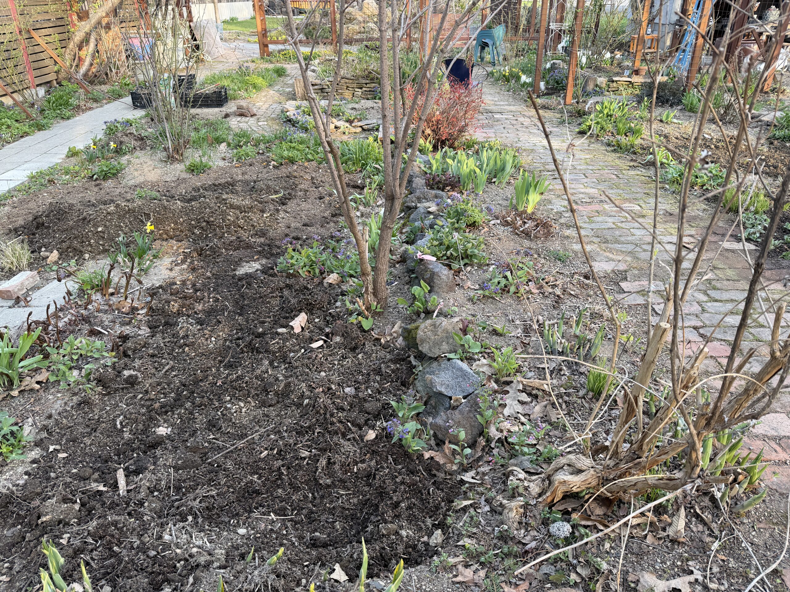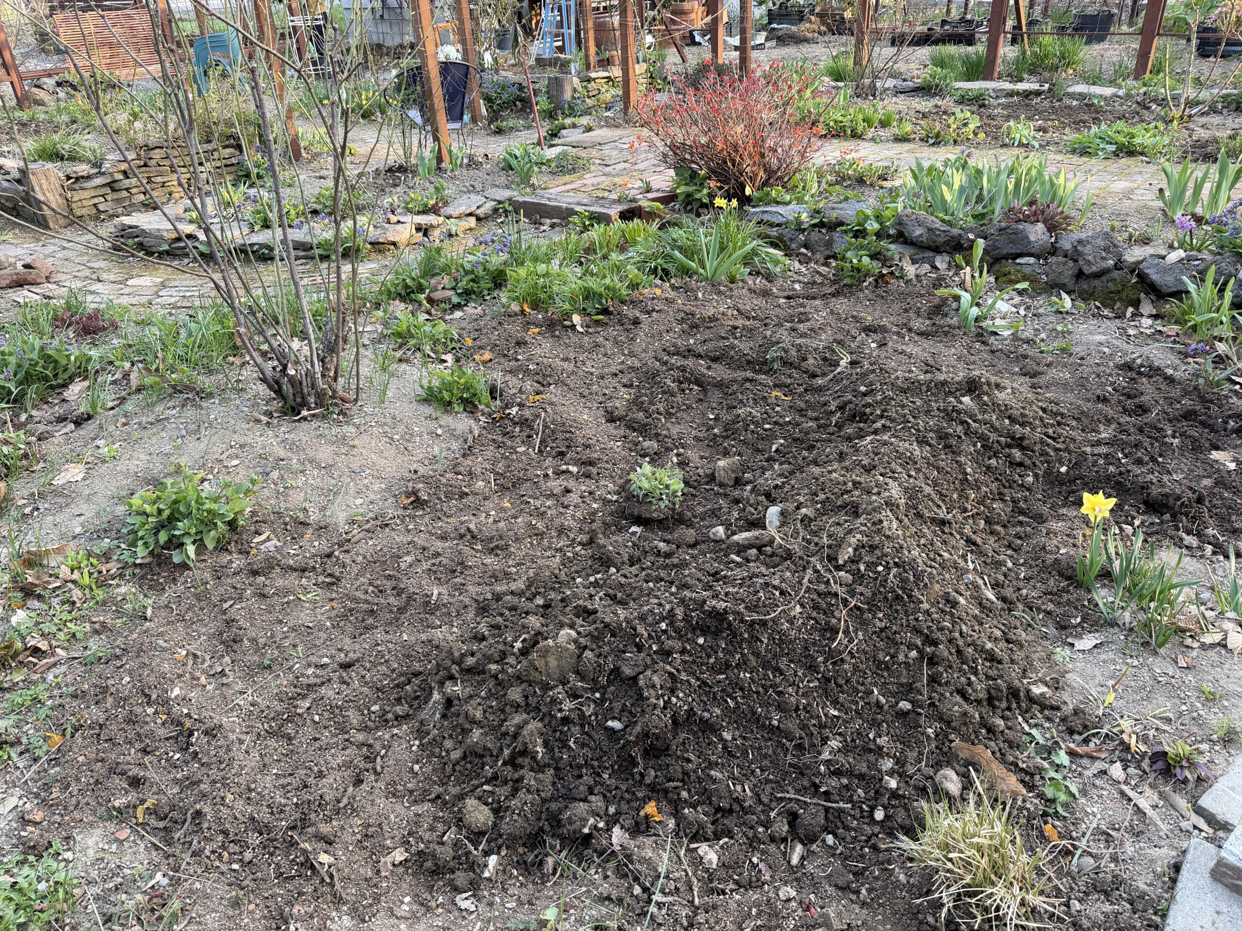 石臼の設置、サクラの移動、土の移動、除草、整え、バラの剪定誘引、大鉢に入っている植物の鉢増し、剪定、植え込み、、、