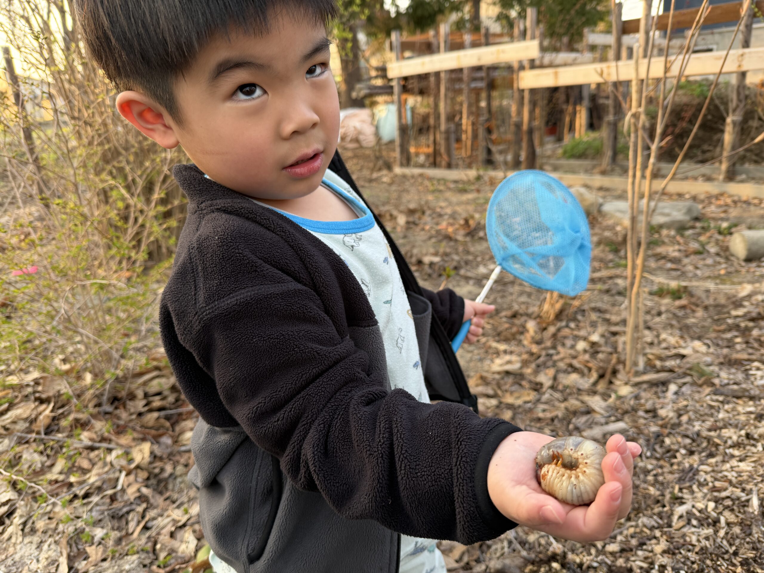 夕方、みんなが帰ってから、ウッドチップを道に散らそうかと、スコップ入れてみたら、、そこから出てきたのは大きな幼虫。