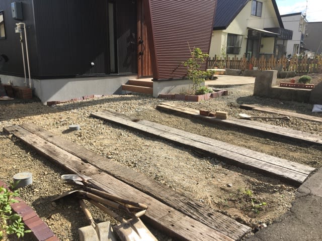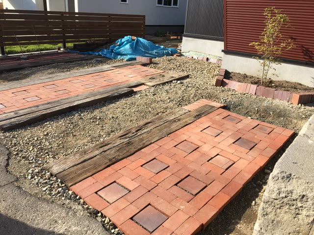 若夫婦の家ですが、家族で枕木やレンガを敷きました。
