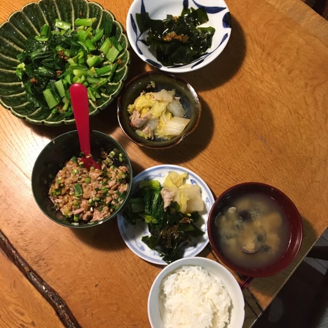 しじみの味噌汁、ご飯、ワカメのネギダレ、白菜と豚肉の煮物、小松菜の醤油とオリーブオイルかけ、シーチキン納豆。