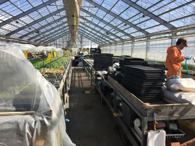 温床もあるタネ播きのハウスでは、ナスやピーマンの苗が過保護に育てられ、