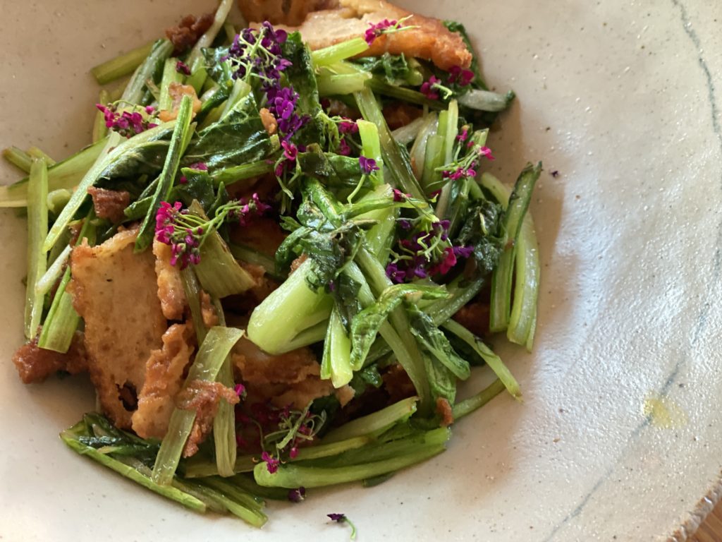 さっと茹でた菜の花にオリーブオイルと塩、味にコクを出すためベトナムの魚醤ニョクマムも隠し味程度に。