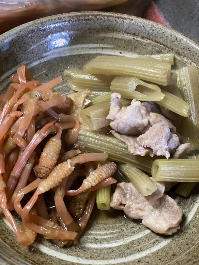 そしてわらしべ長者その③は隣にピザ持っていたら、ちょうどできていた初物母作のフキとツクシの煮物。
