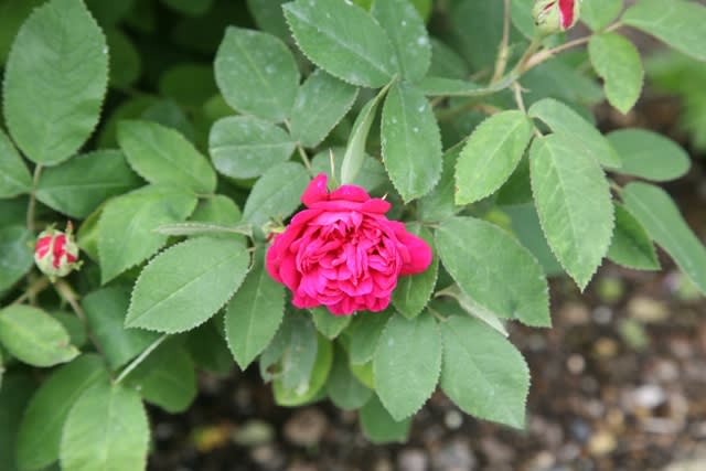 一重のシャクヤクが咲き、八重のシャクヤクは開花寸前。バラの蕾が膨らみ、ローズ・ド・レッシュが今年の一番乗り。