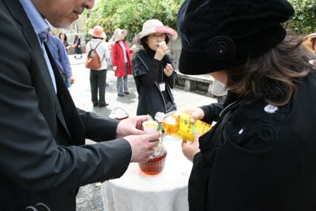 住宅街の街路樹のある歩道が広くとってあり、そこでお茶です。